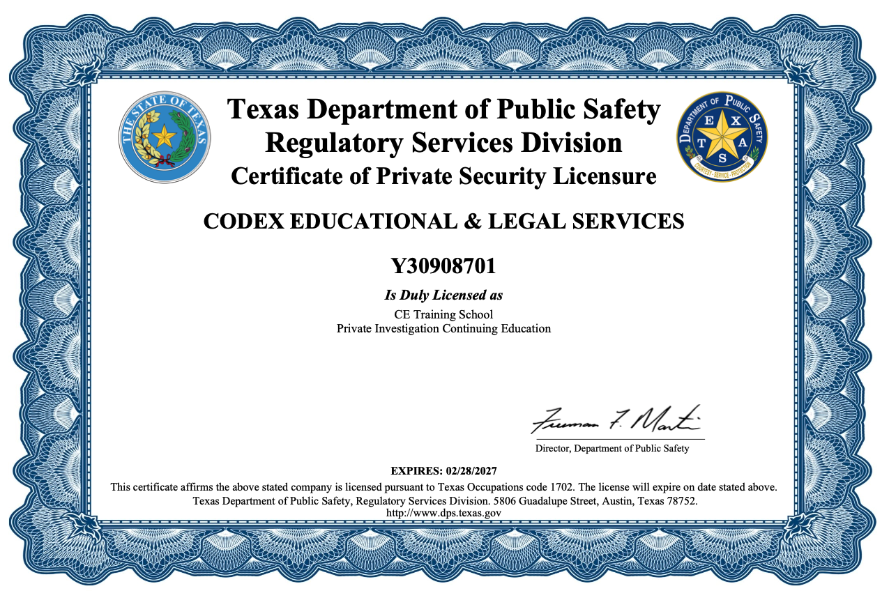 CODEX Educational & Legal Services is licensed by the Texas Department of Public Safety, Regulatory Services Division, Private Security Program to provide Continuing Education (CE) courses for licensed Private Investigators in the State of Texas.